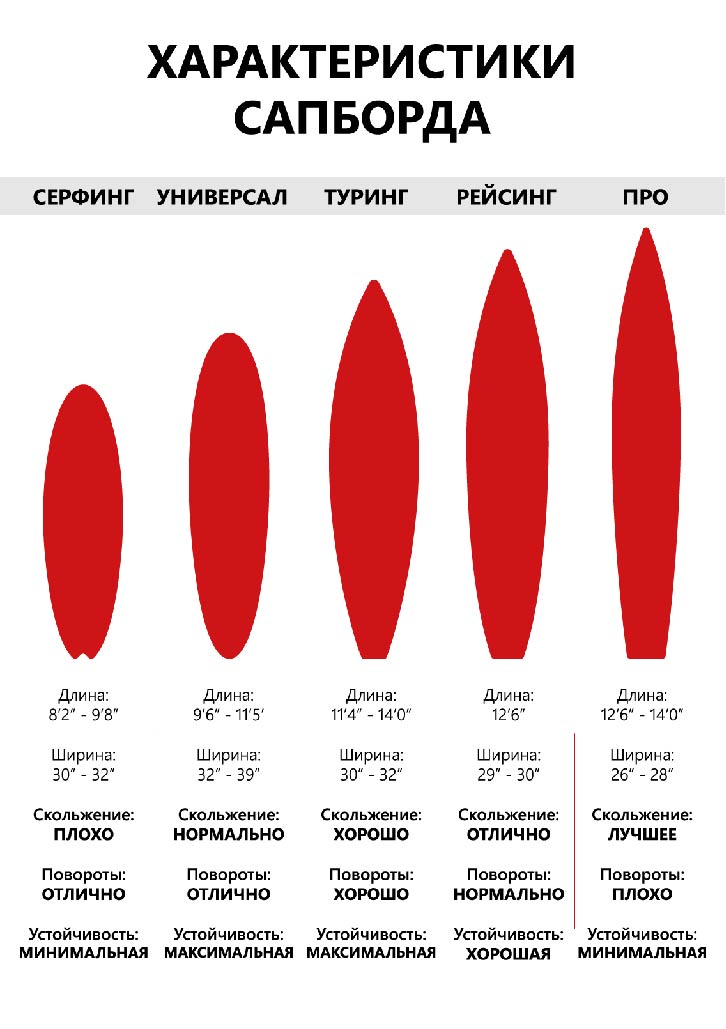 Каждому типу SUP-доски присущ свой стиль гребли. Размер и форма доски влияют на направление и эффективность движения. Длинные SUP-доски намного быстрее в пути и устойчивее, однако возникают трудности при их транспортировке и хранении.